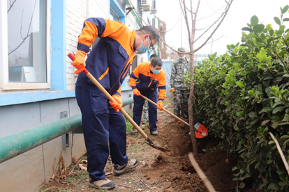 当天下午一点半左右,在公司党支部的组织和带领下,大家带着工具,走进现场开始种花植树。活动现场,党支部书记邢卓带领大家,先植树,再种花。党员们身先士卒,挽起衣袖、拿起铁锹带头干,其他人员也不甘示弱,一个个干劲十足,挖坑、放苗、填土、浇水,大家相互配合,有条不紊,忙的不亦乐乎。