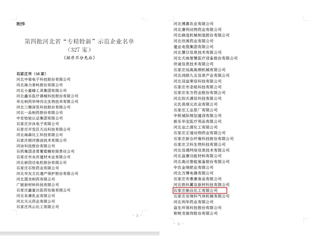 随着河北省工业和信息化厅12月17日“关于第四批省级‘专精特新’示范企业名录”的正式公式及12月30日“第四批河北省‘专精特新’示范企业的通知”的下发,驰远化工申报专精特新中小企业以及示范单位项目已尘埃落定。
