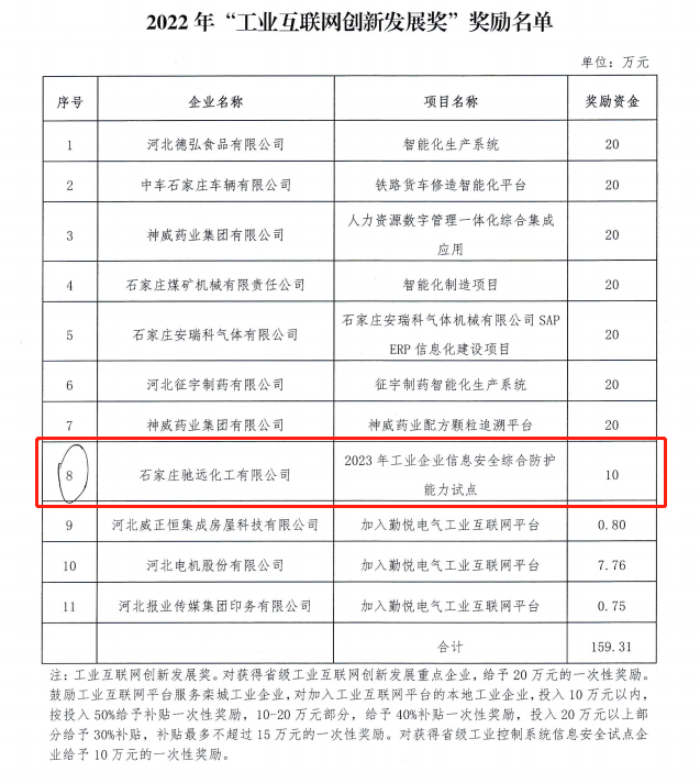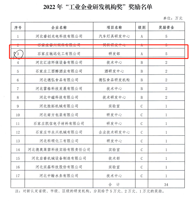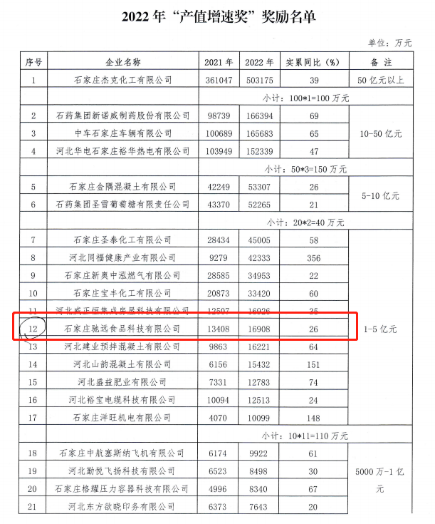 为进一步支持我区工业企业高质量发展,发挥工业在全区经济发展中的主力军作用,加快促进工业转型和跨越式发展,提升区域经济发展质量和竞争实力,建设经济强区、美丽栾城,栾城区政府根据相关政策措施研究决定,对符合条件的项目和企业给予奖励和补助,最终评定石家庄驰远化工有限公司获得“2022年工业互联网创新发展奖”、“2022年创新主体培育奖”、“2022年工业企业研发机构奖”,石家庄驰远食品科技有限公司获得“2022年产值增速奖”。